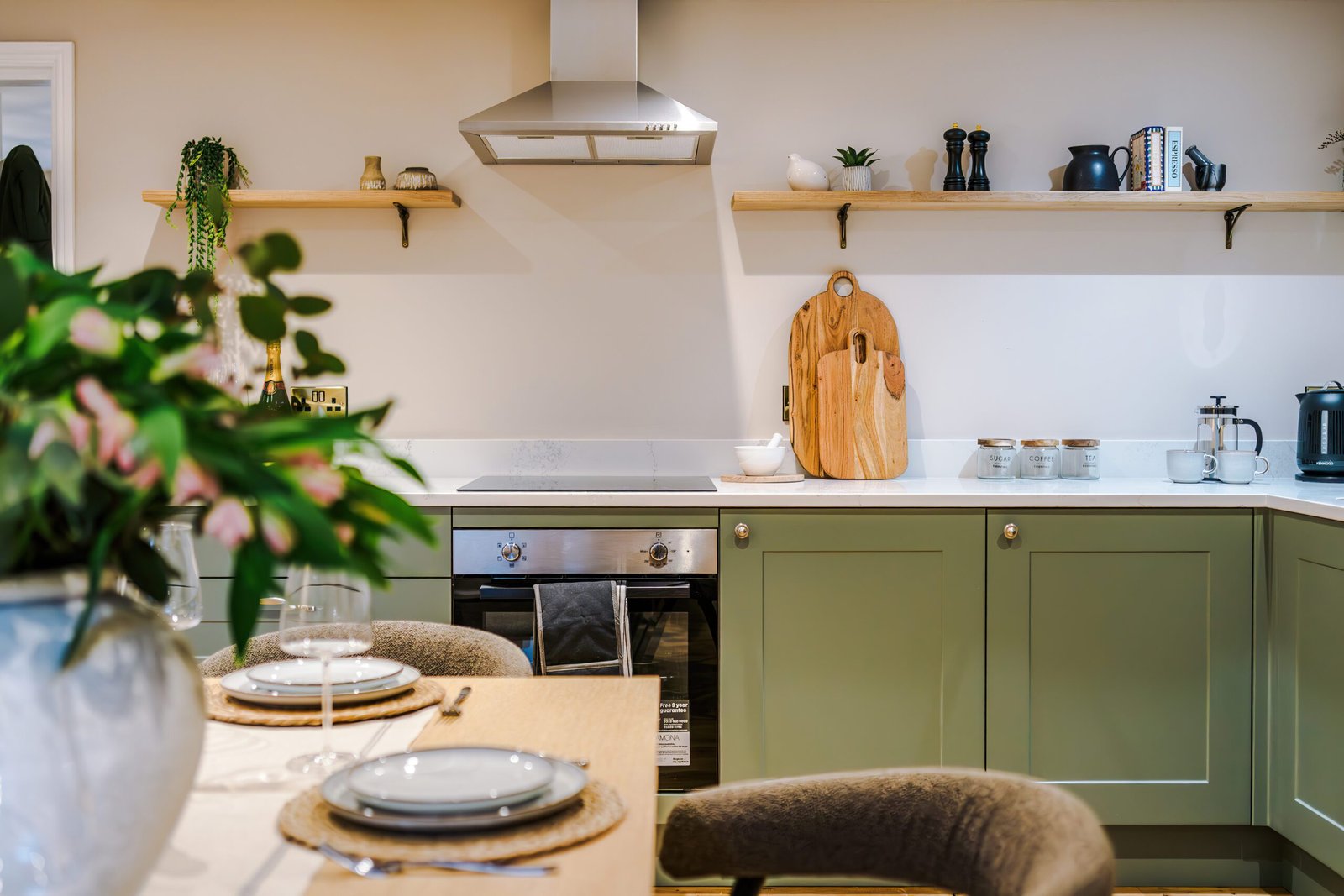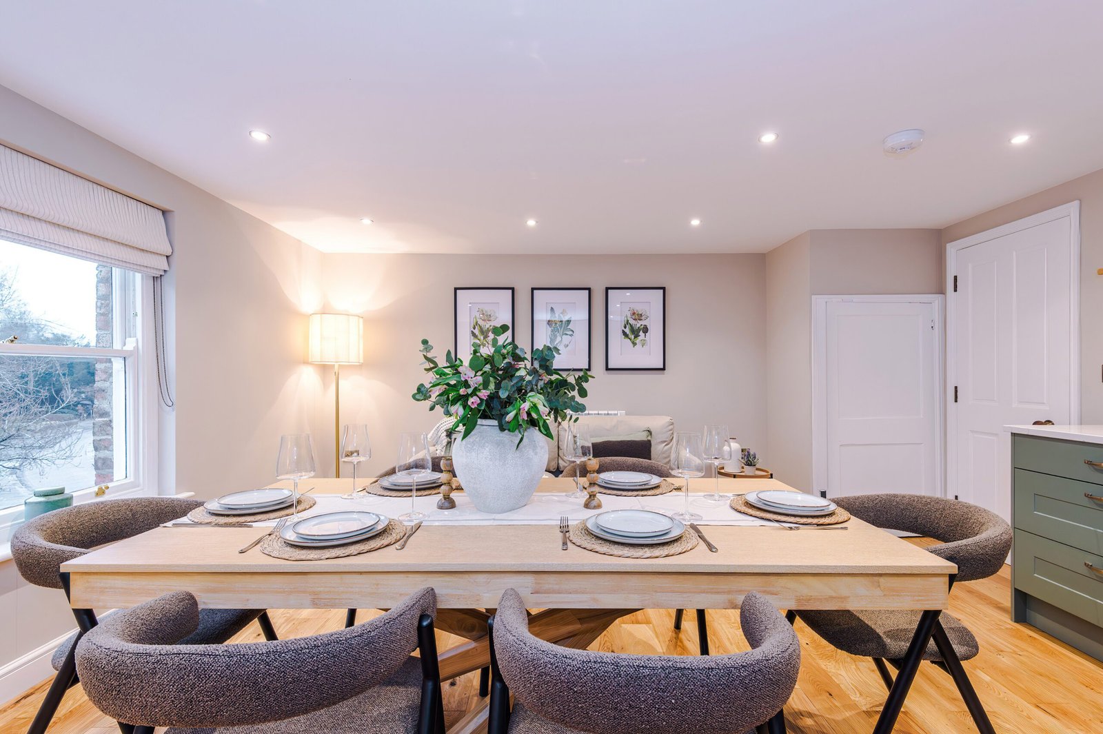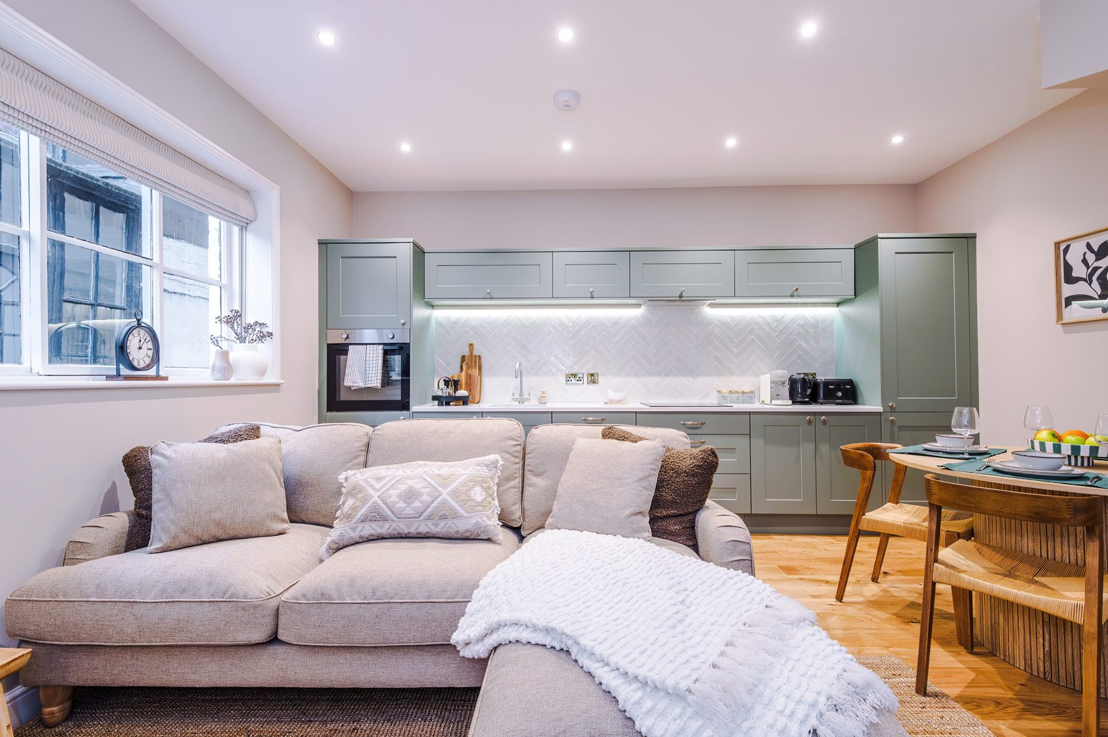 The first floor reveals a stylish kitchen and dining space, beautifully finished and fully equipped for everything from informal breakfasts to celebratory evening meals. Elevated views towards Ripon Cathedral provide a striking backdrop and a constant reminder of the apartment’s exceptional location.