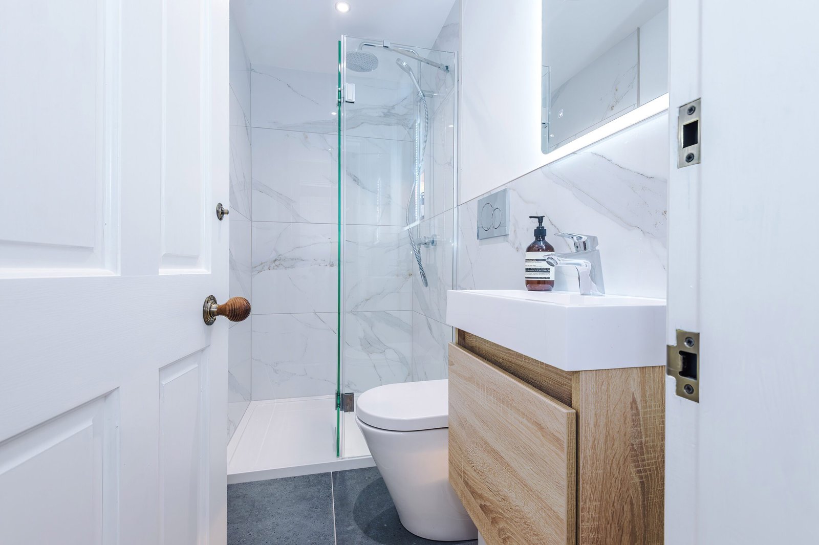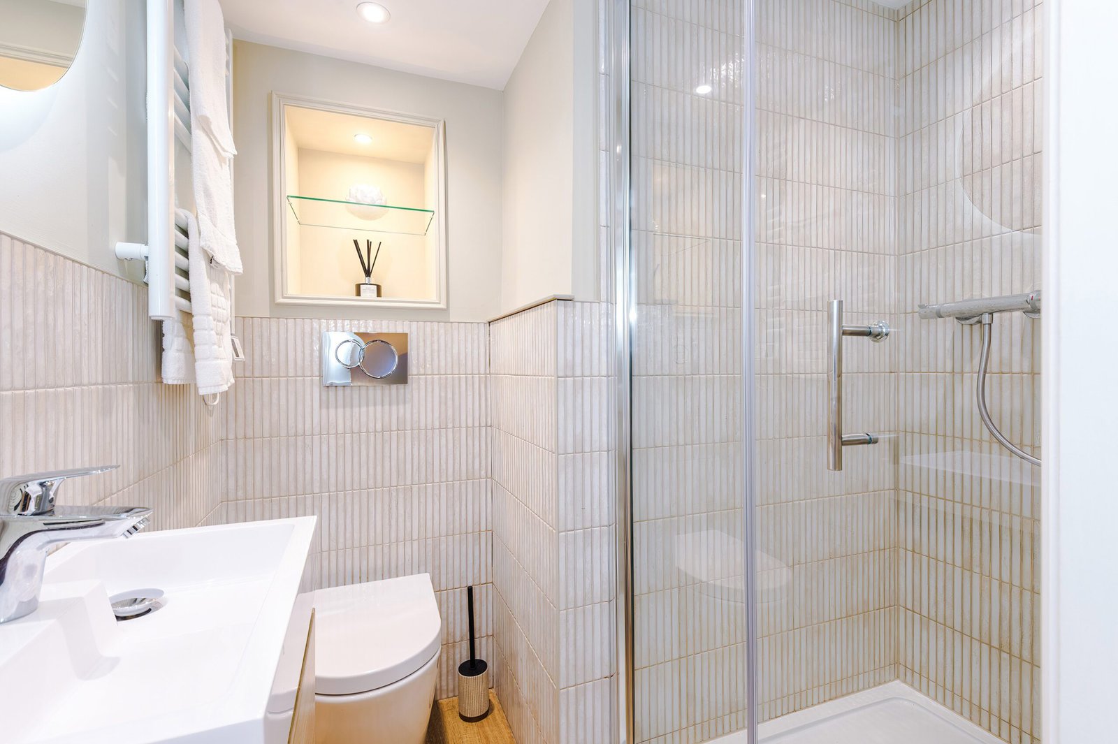 Across the upper floors are three generously proportioned bedrooms, each with its own en-suite bathroom, ensuring comfort and privacy for every guest. The master bedroom occupies the top floor, offering a calm and luxurious retreat away from the main living areas. Throughout the apartment, original architectural features are paired seamlessly with contemporary finishes, creating a space that feels both timeless and indulgent.