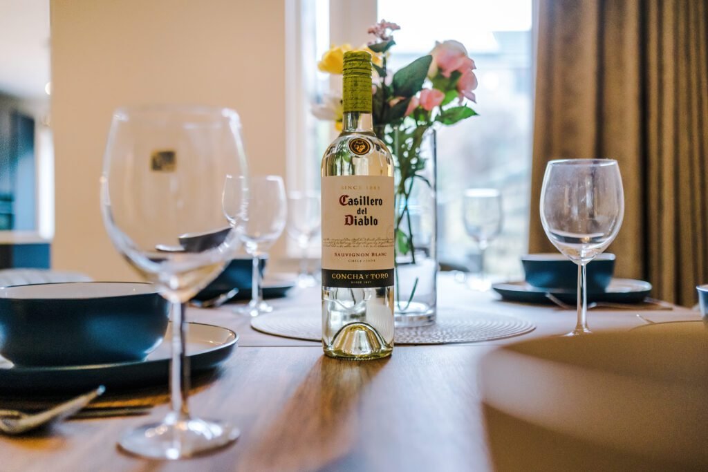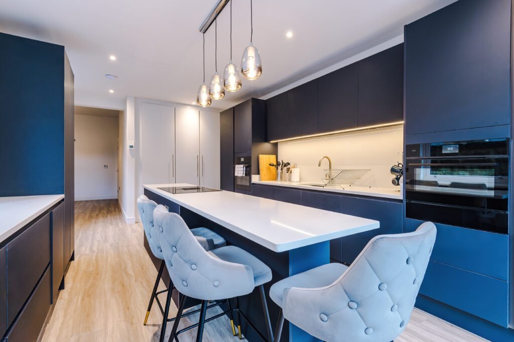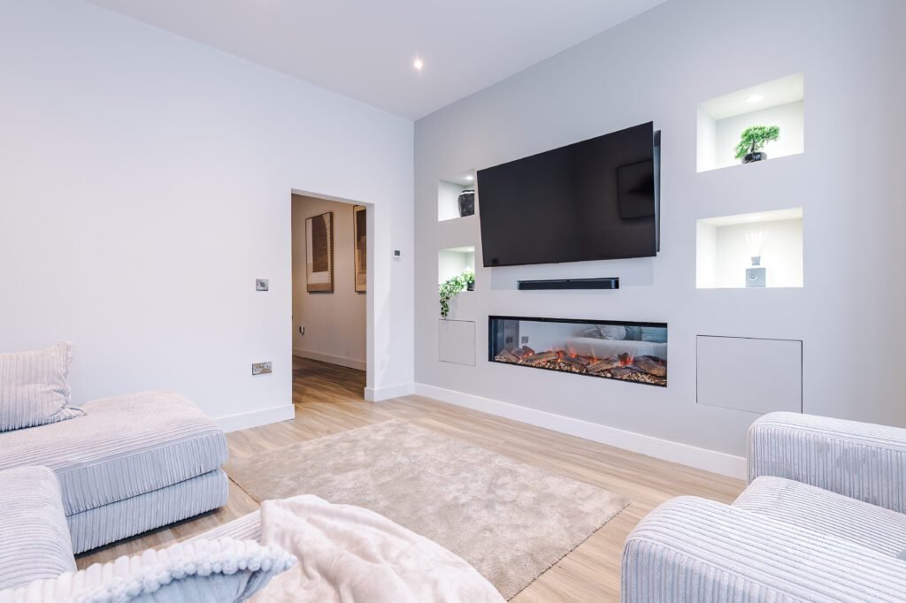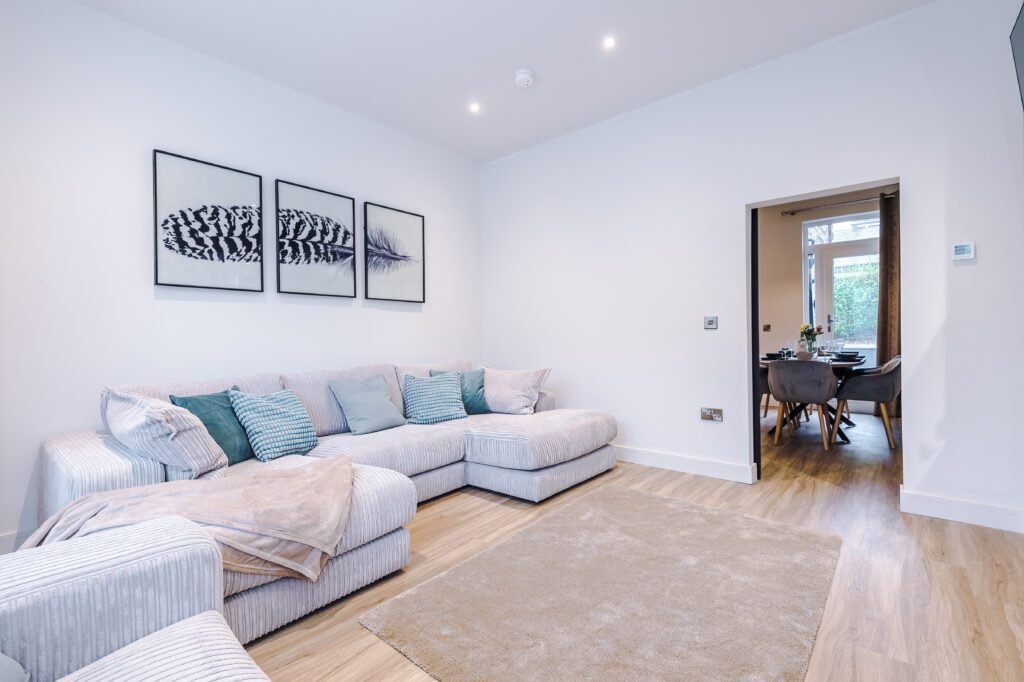 The ground floor offers a generous dining room with seating for six, ideal for relaxed meals or working together, alongside a cosy living room featuring a large wall-mounted Smart TV for evenings in.